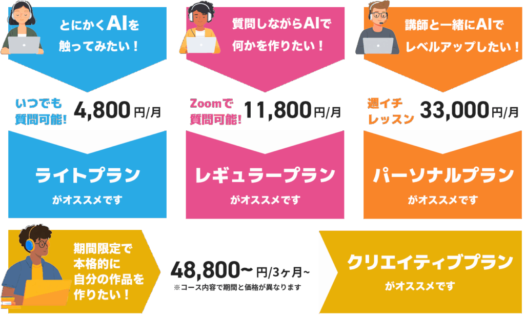 Takarazuka AIラボでは、目的やレベルに合わせて3つのプランをご用意しています。